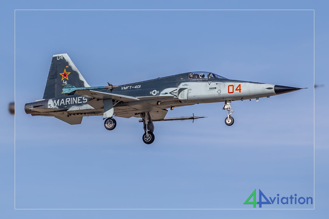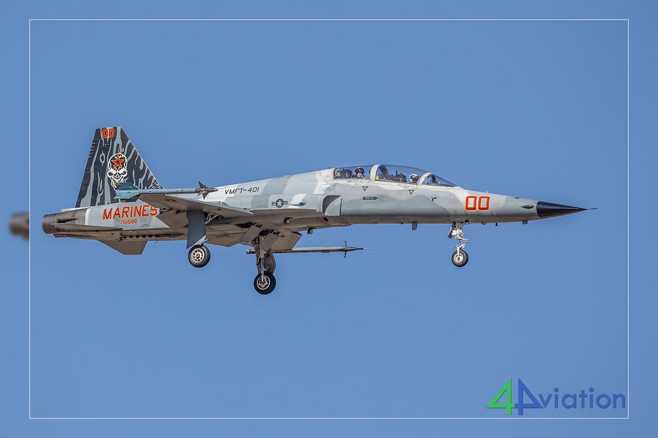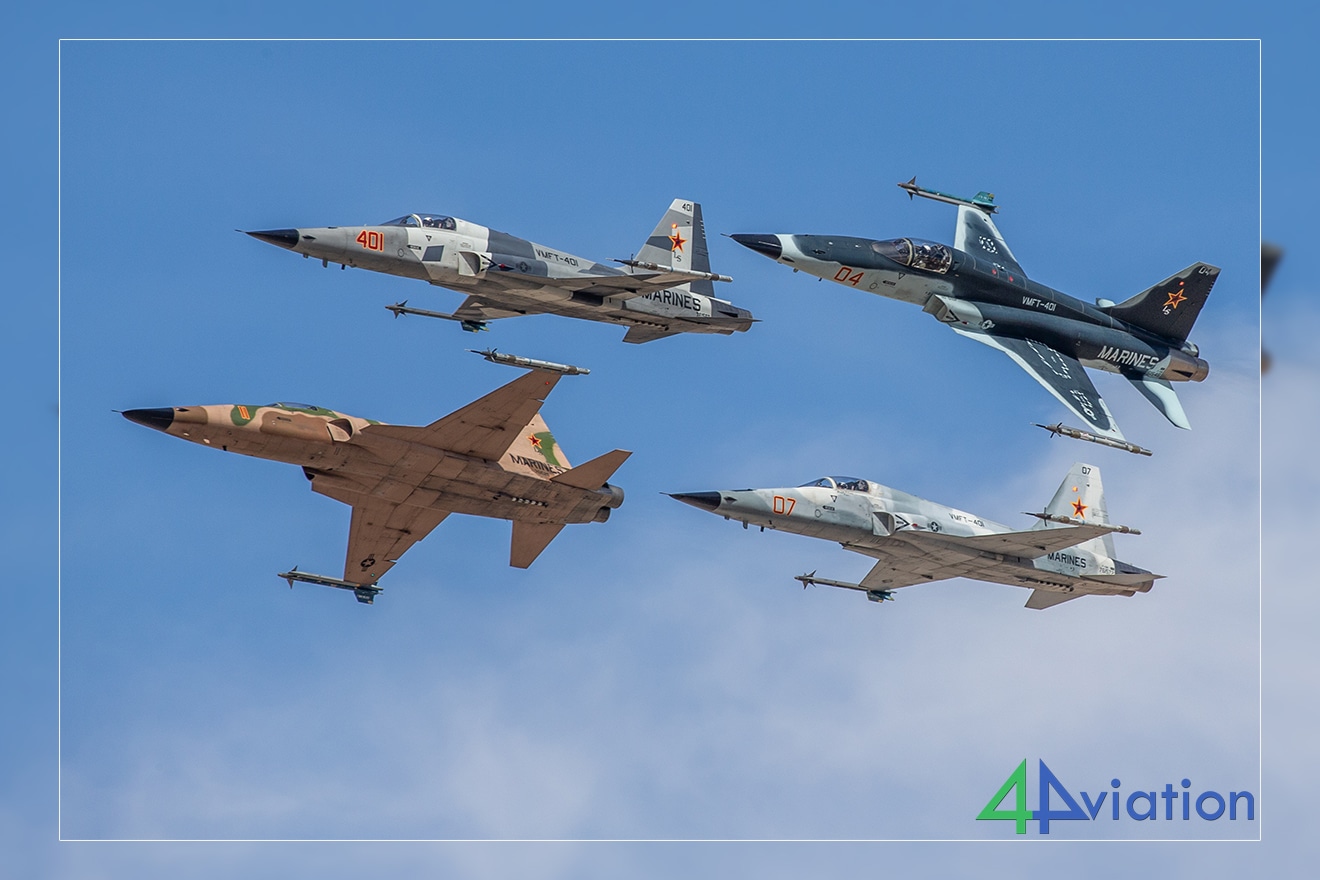 De laatsten, waaronder het toestel van VFMA-122 CAG, vermaakten ons twintig minuten lang met rondjes vliegen, waardoor we van positie konden veranderen en verschillende hoeken voor onze foto’s konden vastleggen. Al deze actie werd tien minuten later overtroffen door de sterren van de show; twee kleurrijke F-5 aggressors van VMFT-401.
